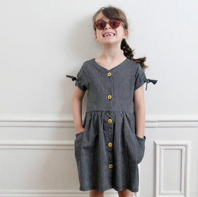 What you will practice with this sewing pattern: how to assemble a facing, how to sew patched pockets, how to gather, how to assemble fancy short sleeves, how to do French seams.