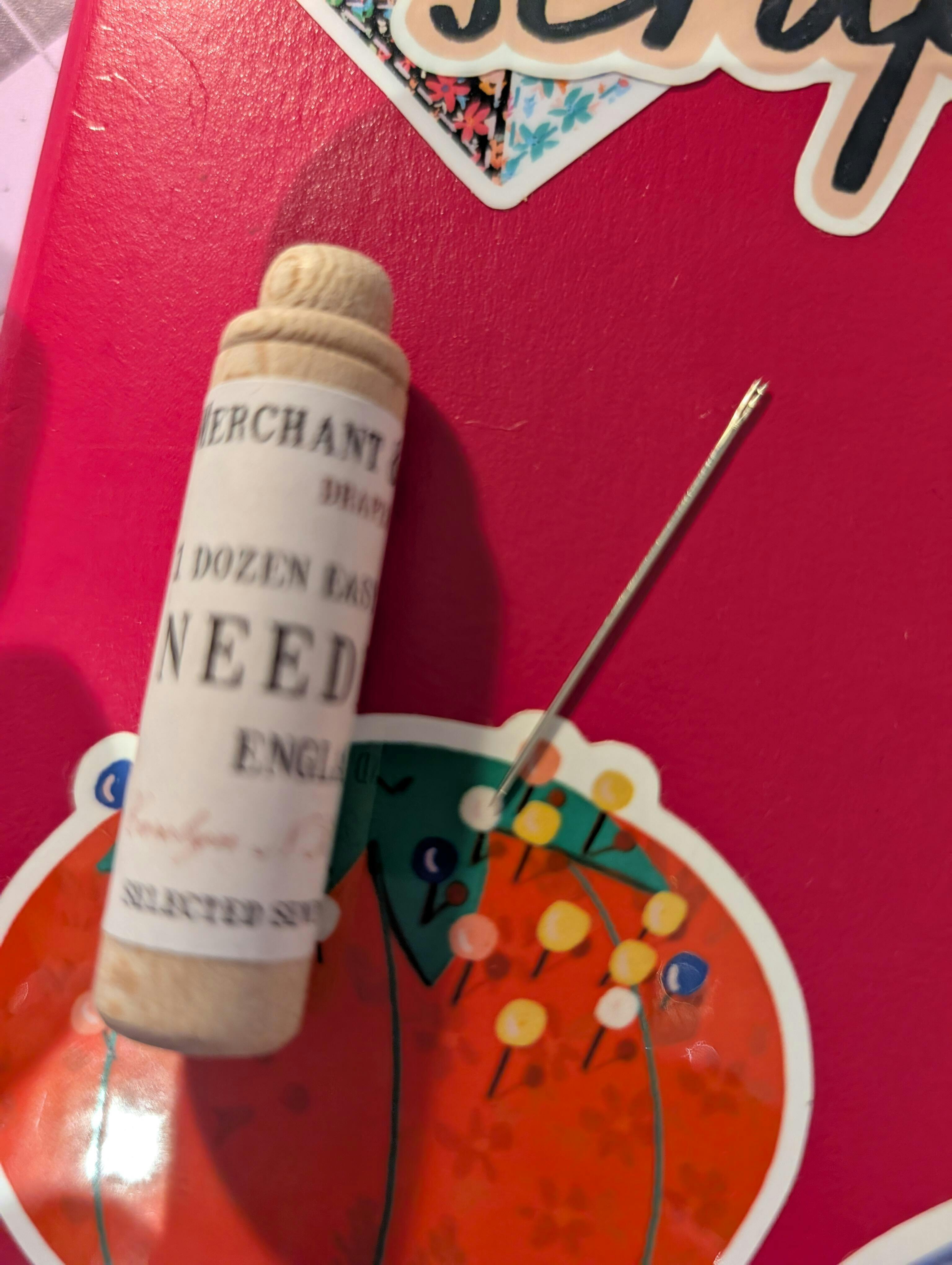 12 assorted size easy thread needles in turned wooden case. Fits in any bag or pocket.