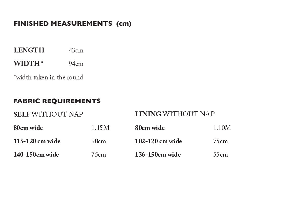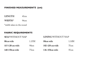 Fully lined with 3 divided internal pockets, for external pockets you will need an additional 30cm of self fabric.