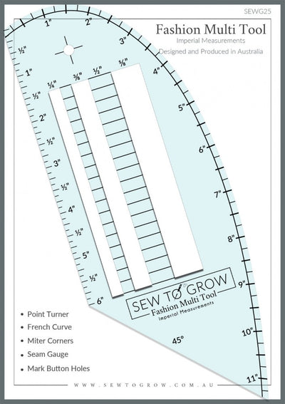 This tool is made from 1/8in thick acrylic making it easy to mark with and follow along the curves and is in imperial measurements. Take the Fashion Multi Tool with you to class, or have it hanging in your sewing room, with-in easy reach, with the convenient hang hole. Directions on how to use this tool are included in the packaging.
