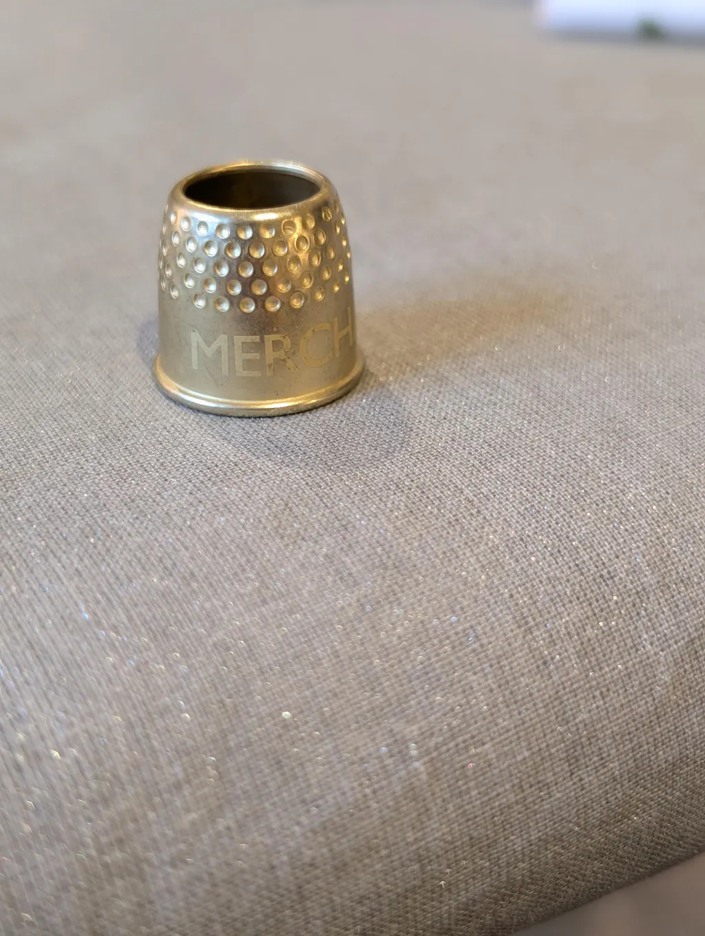Solid brass tailor's thimble with a hole at the top - with an etched 'Merchant & Mills' logo.