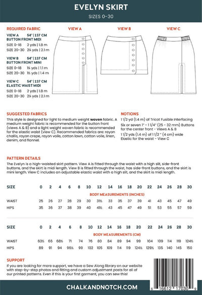 The Evelyn is a high-waisted skirt pattern. View A is fitted through the waist with a high slit, side-front buttons, and the skirt is midi length. View B is fitted through the waist, has side-front buttons, and the skirt is mini length. View C includes an adjustable elastic waist with a high slit, and the skirt is midi length. Sizes 0-30.
