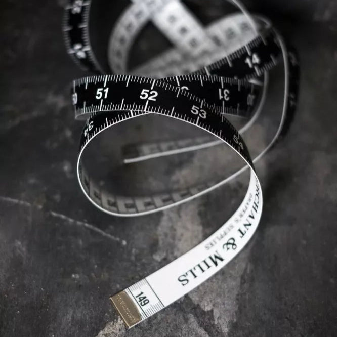 A traditional black & white tailor's tape measure in metric and imperial with metal tips.