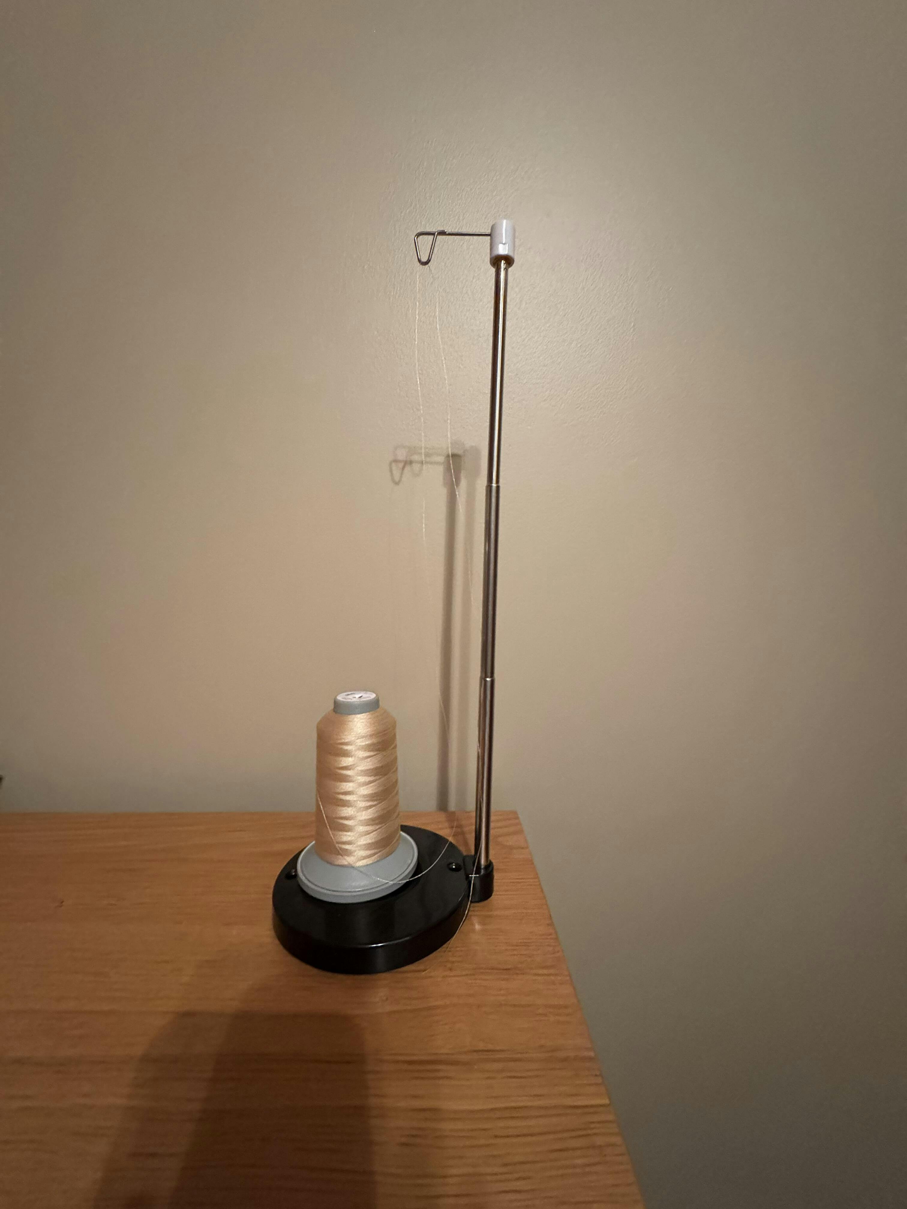 Adjustable height thread stand. Sturdy base that won't tip over. Easy to transport. Minor assembly required. Base is 5 inches in diameter. Adjustable from 6 to 15 inches high.