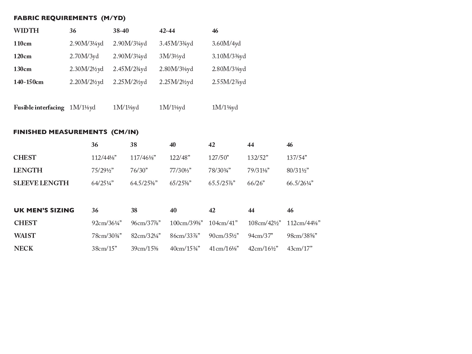 Fabric suggestions - dry oilskin, cotton canvas and twill, 8-13oz denim, mid-heavyweight linen, corduroy, woolen tweed.