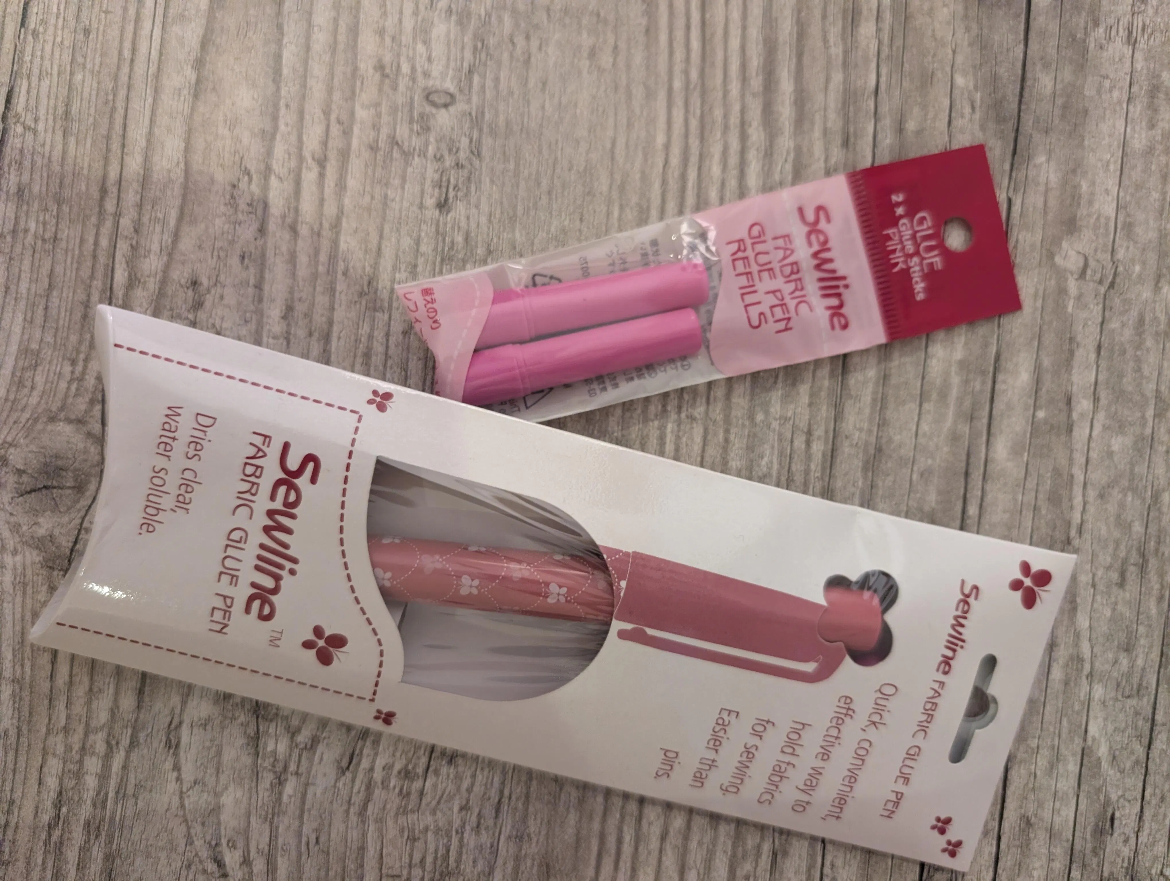This clever glue stick means the end of sewing around pins! A water-soluble blue glue that dries clear is a quick, convenient way to hold fabrics for sewing. Great for quilting and applique work but also for hemming and general sewing. Once glued, the fabric pieces can be pulled apart, so not to worry if they are misplaced or need to be adjusted. Wonderful time saver for English Paper Piecing. Easily refillable-refills available separately.
